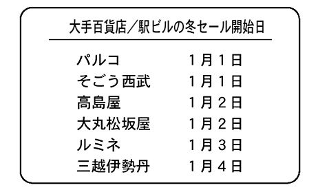 三越伊勢丹は年明けの冬物クリアランスを昨年から一週間早めて1月4日に開始する。バーゲン後倒しの盟友、ルミネも昨年の冬バーゲンは1月3日に開始しており、今年も同日の開始となる。他大手百貨店はそごう・西武が1日、大丸松坂屋と高島屋が2日に開始するから、12年の夏バーゲンから続いて来た混乱もようやく収拾される事になる。