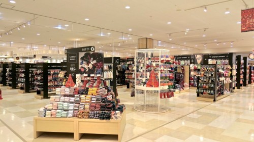 売場面積はほぼ400坪で、インナーが200坪、レッグウエアが50坪、ルームウエア/ナイティが50坪、ホームカジュアルが100坪という構成。ウィメンズが60%、メンズが40%でキッズは扱っていない。